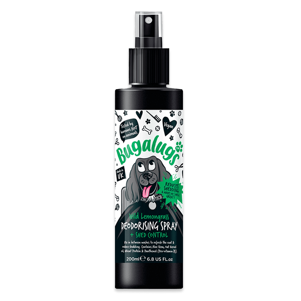Bugalugs Wild Lemongrass Dog Deodorising Spray with Shed Control renser, opfrisker, nærer og reducerer fældning med en langvarig, frisk duft af vild citrongræs.